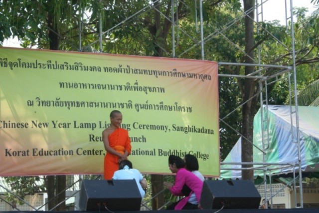 His eminence Phrakittirammamuni, Chief-Sangha of Pakthongchai District led the most venerable abbots of Wat Monmawat, Wat Podaeng, Wat Phothong, Wat Nakhe and Sangha representatives of Wat Klang and Wat Amphavan monasteries to initiate the annual Lamp Lighting Ceremony with Pali sutta chanting. Ven Zhen Chan then led the Mahayana Sangha students of IBC to perform the Chinese Chanting. We pray and hope for a peaceful and calamity-free year. May all beings be free from enmity, physical and mental suffering and be well and always happy.