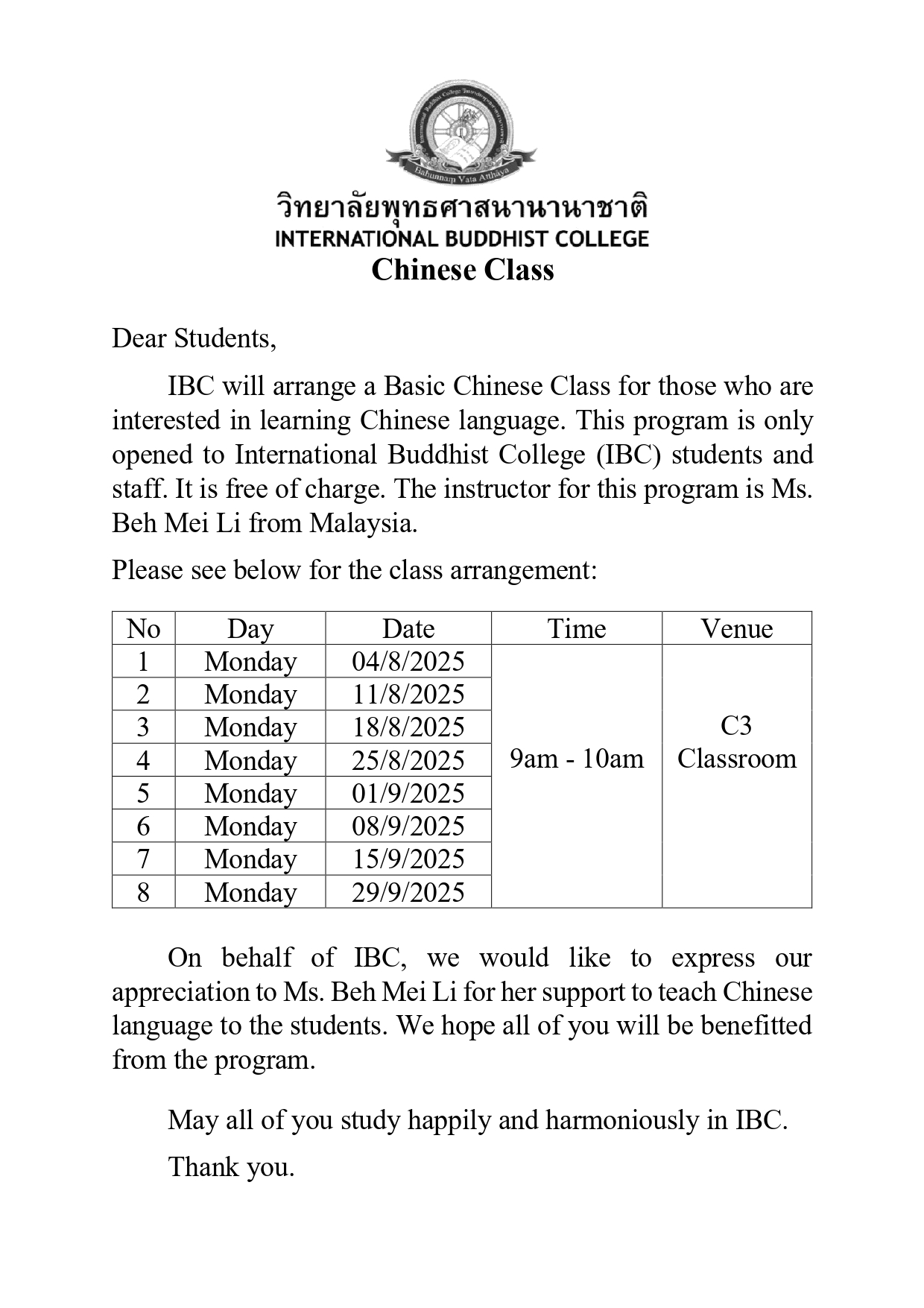 Good morning. IBC will organise a Chinese Class this semester for those who are interested in learning the language. It is free of charge and will be conducted on Monday morning (9am - 10am).