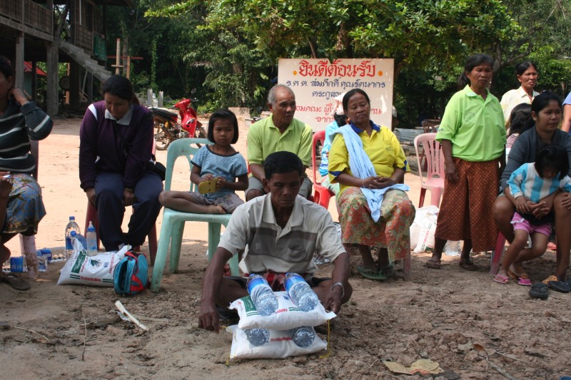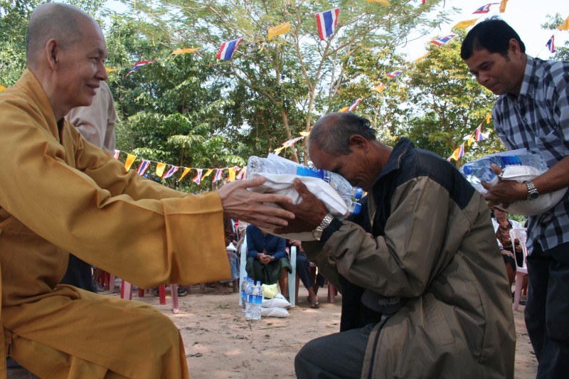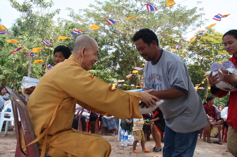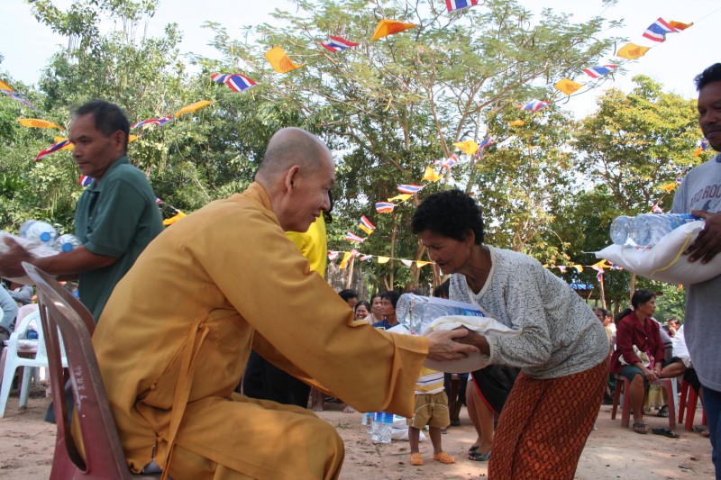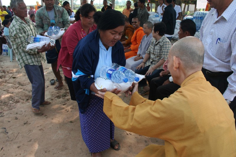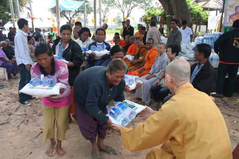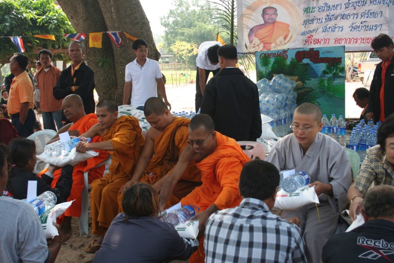 Ven. Wei Wu with ibc staff and students distribute rice, drinking water and money to the flood victims