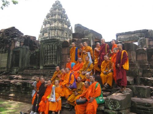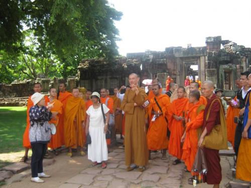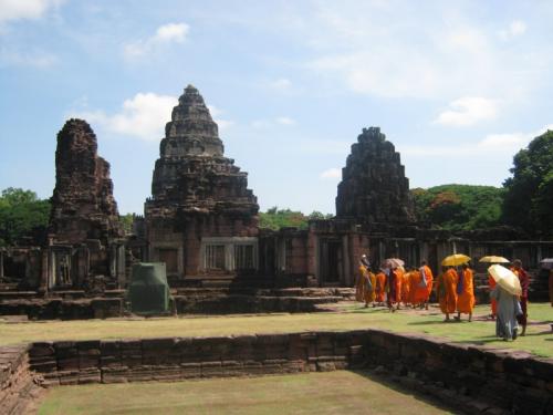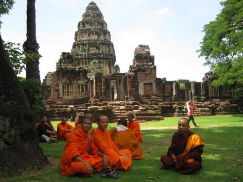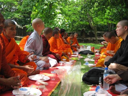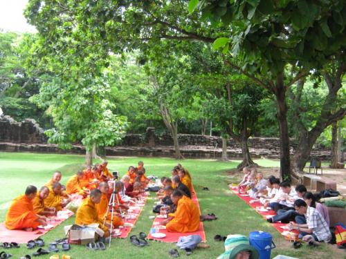 As usual everybody moved towards the bus and sat on seats of their liking. With a very moving Pali chanting in the bus our journey began to the sightseeing of the Korat Province. Headed by Ven. Zhen Chan, the director of student affairs, first of all we arrived at Phimai Historical Park. It was really an amazing visiting spot. A guide took us around it explaining the history, architectural style and significance of the park. We came to know that it was built around 11th - 12th century A.D., some years before Angkor Wat of Cambodia was built, during the reign of king Suriyavarman - a Khmer king. The architectural style and the images on lintels represent the Brahmanic influence, though it was mainly a centre for Mahayana Buddhism. Built of bricks and sandstone the Phimai Historical Park is 655 meters wide and 1,033 meters long in its rectangular shape. However, the place appeared to me as a Mandala of Esoteric Buddhism. Finally we had our lunch on the beautiful grassy ground of the Park.