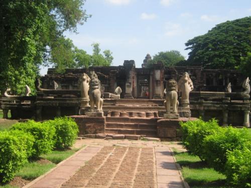Secondly we had been to the National Museum of Phimai. Situated in front of a big pond the Museum attracts the mind of visitors. The first image we came across upon entering into the museum was the sandstone statue of the last great Khmer king Jayavarman - a master piece of the museum collection. The museum, however, stores a rich quantity of arts and architectures of Dvaravati and Khmer styles. This includes the history of Phimai in 11th - 13th century A.D., development of communities in the lower Issan, image curved at sandstone showing the religious rites of the time, and the image of the Buddha sheltered by seven headed Naga, and Shiva - the god of destruction etc.